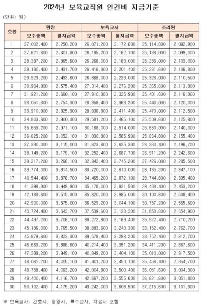 2024년 보육교사 호봉표와 2025년 원장, 조리사 월급 예상
